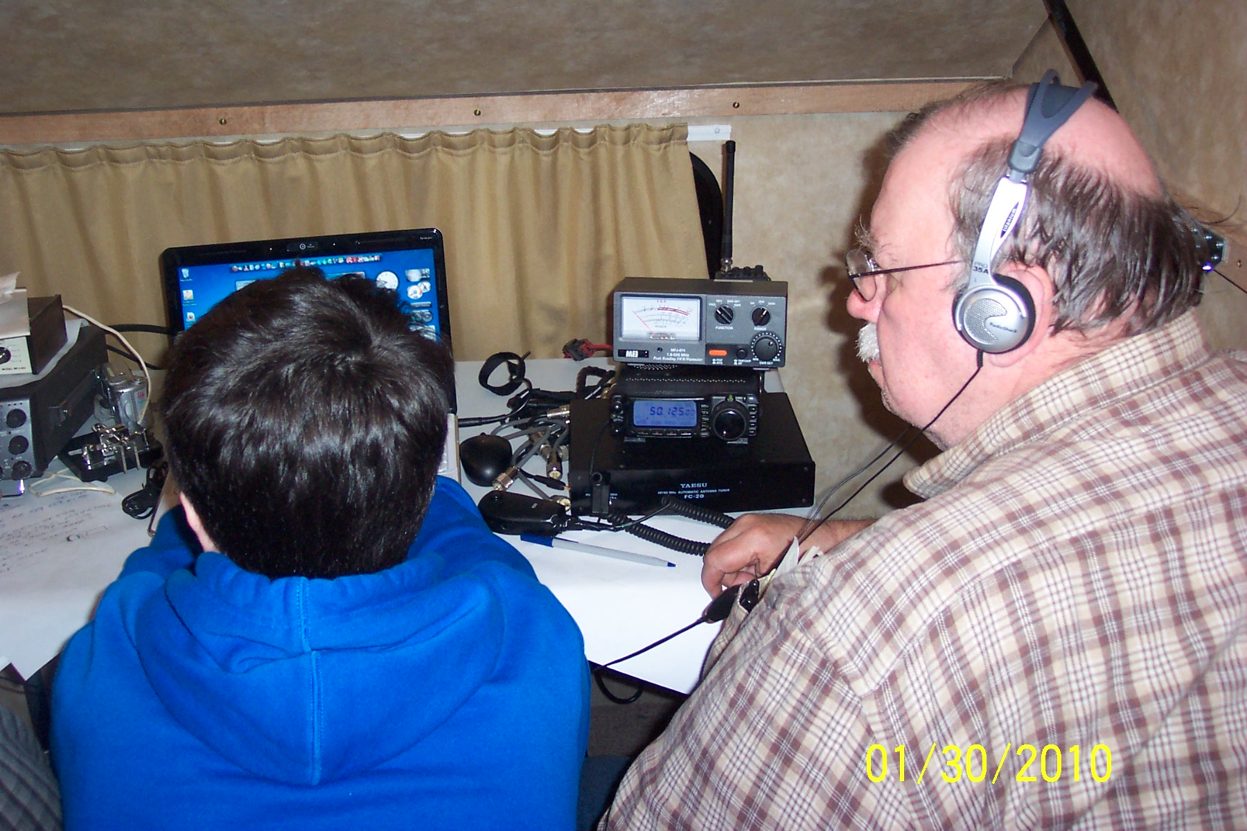 Bill (K3JNZ) looks on as W9QQ and son Matt work a radio as a team at the FT-100 6 meter station.
